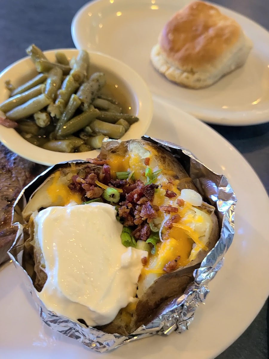 10 Oz Ribeye with Loaded Baked Potato and Green Beans